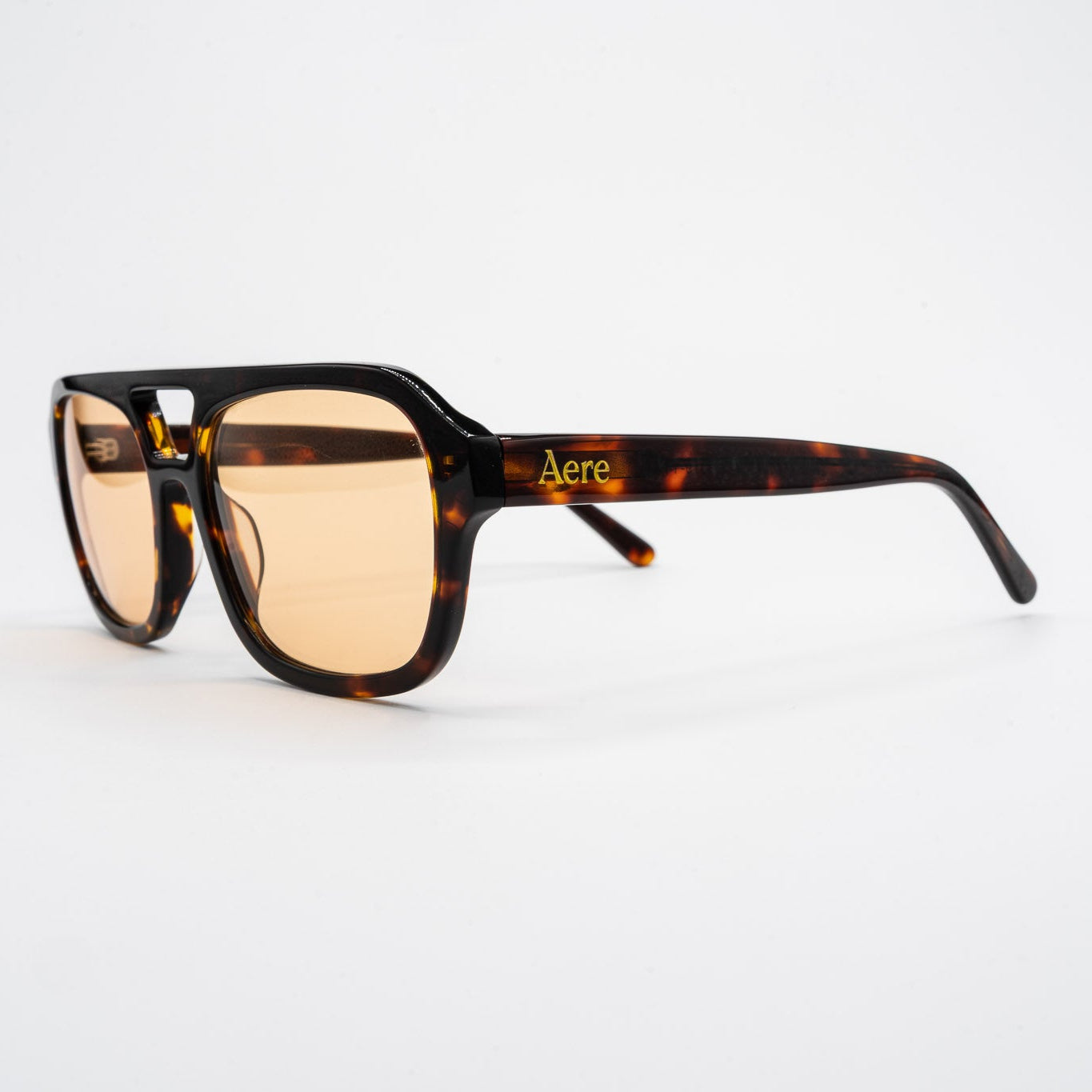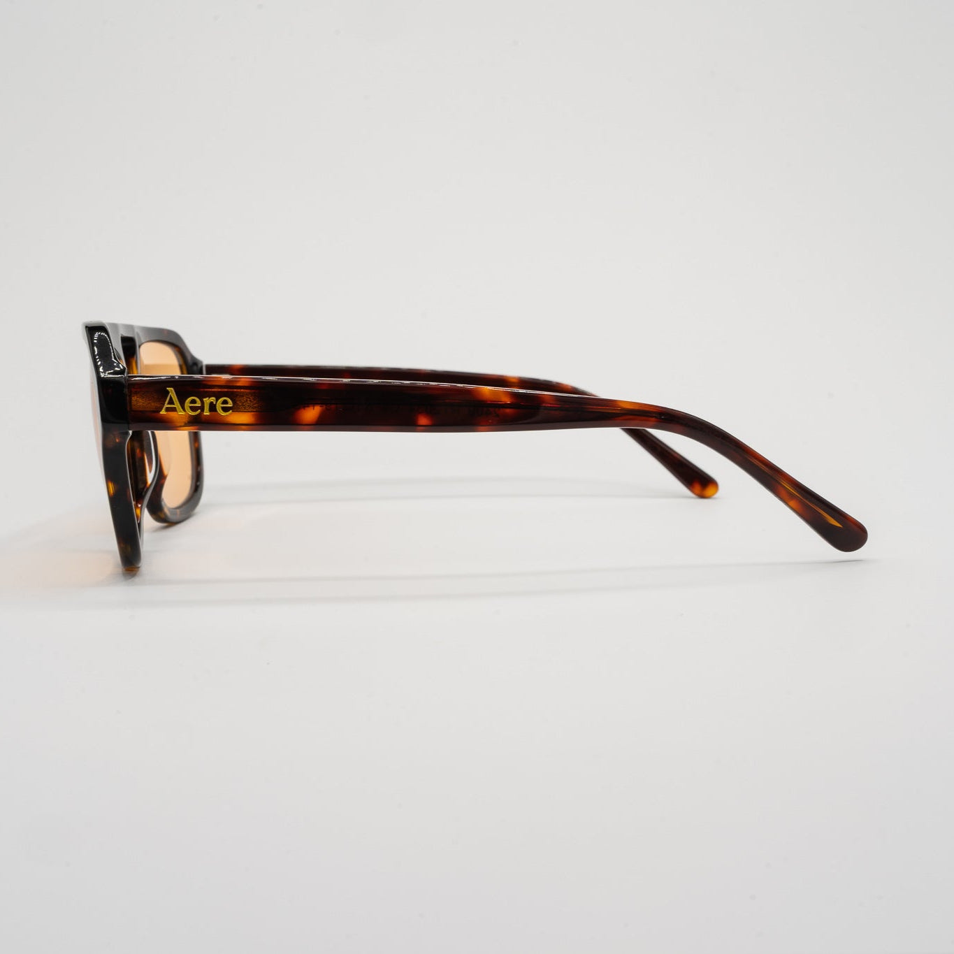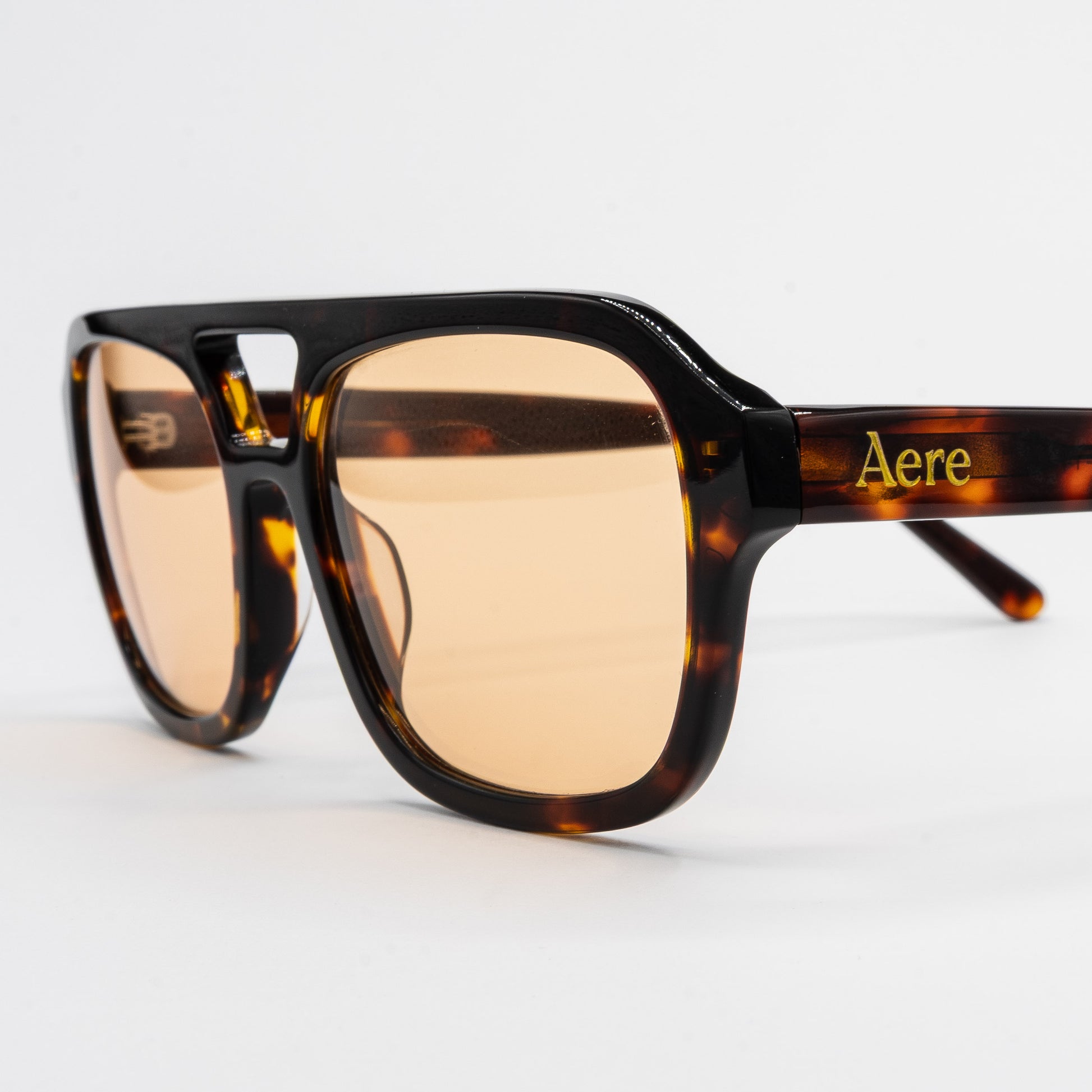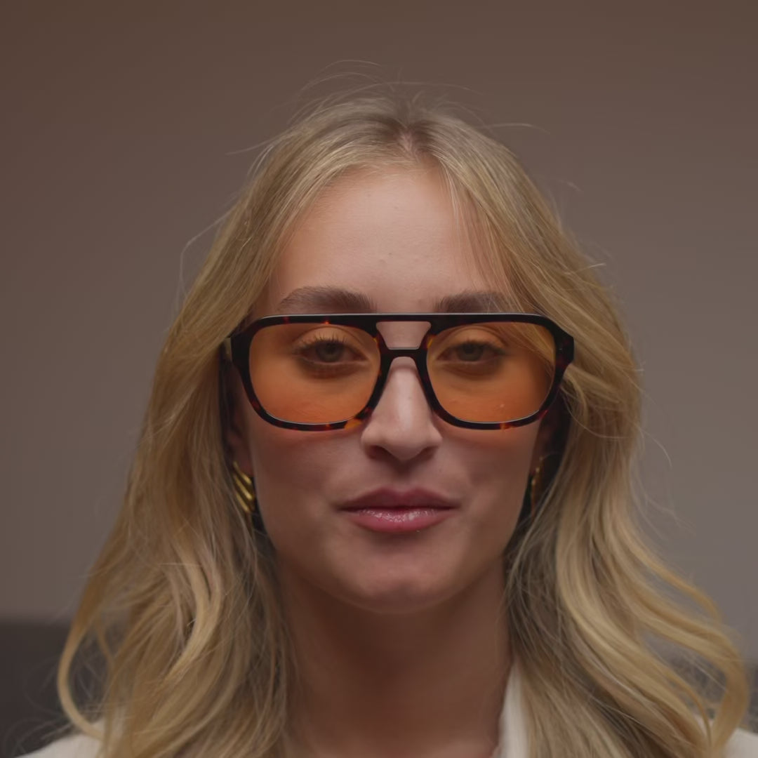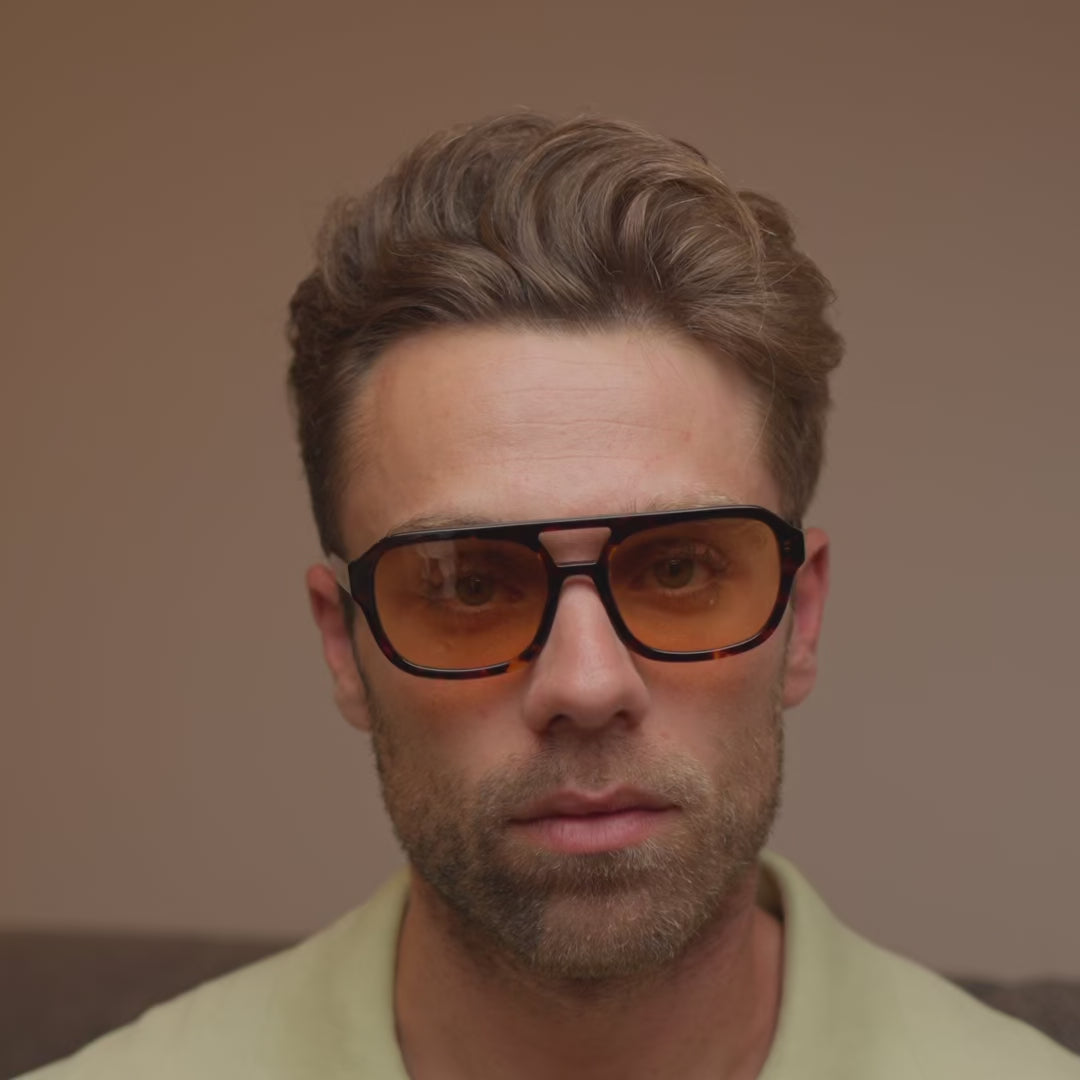 Bold lines meet soft tones in Sunset, a modern silhouette designed to command attention with effortless ease. Featuring a sculpted tortoiseshell acetate frame with orange lenses, Sunset offers a unique blend of structure, warmth and performance. Complete with Aere's signature gold branding, this frame is built for those who move confidently through every setting.